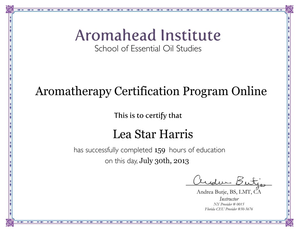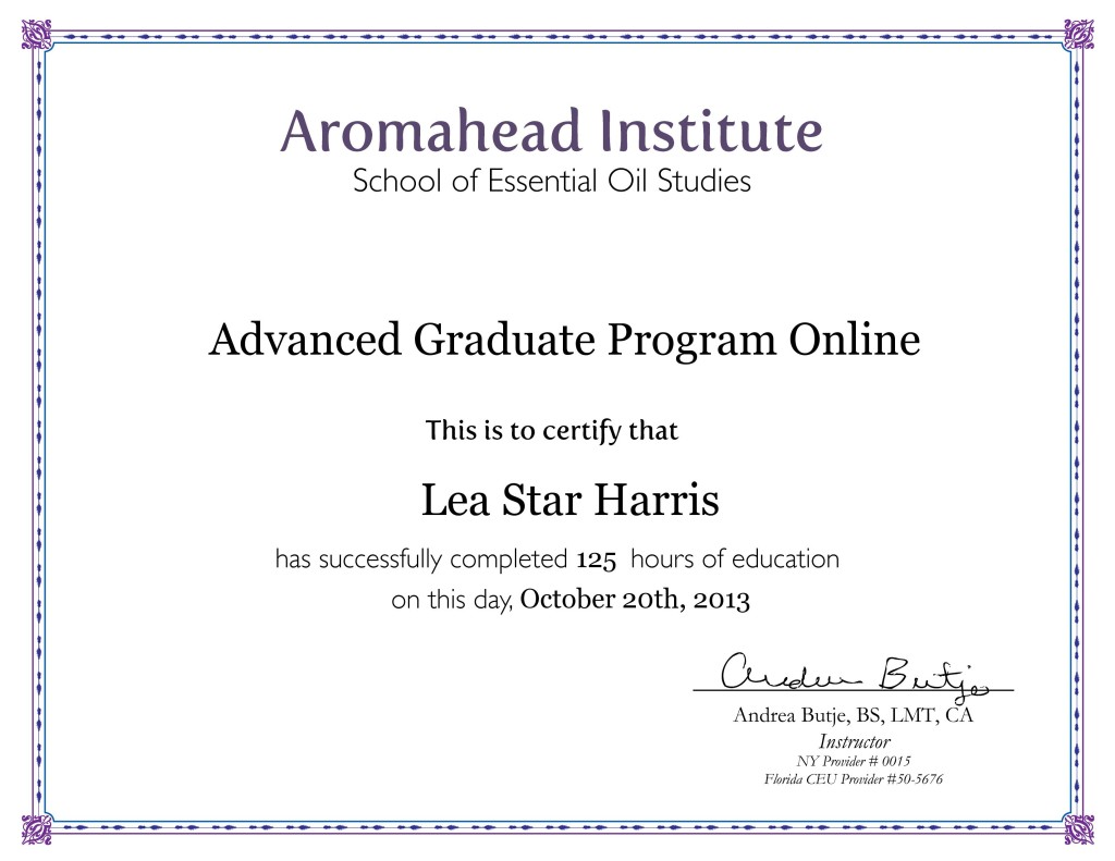 Lea Jacobson (formerly Lea Harris) graduated from Aromahead Institute’s Aromatherapy Certification Program the following week, on July 30, 2013.