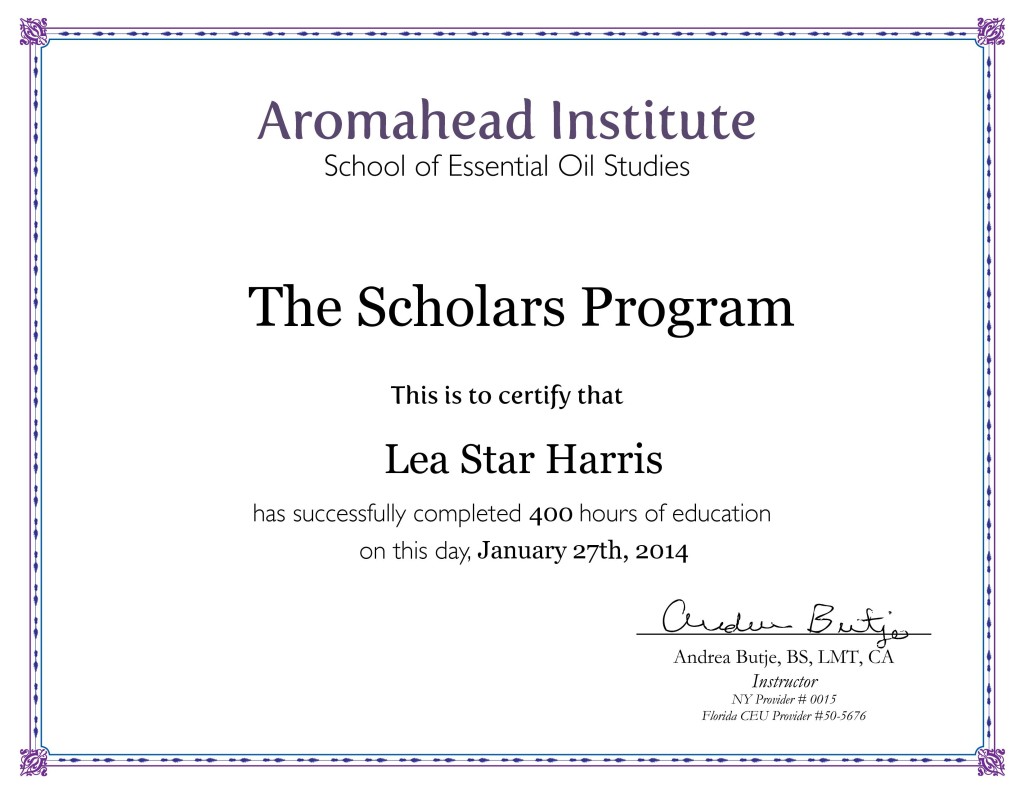Deepening her studies, Lea completed over 400 hours of education through Aromahead‘s Scholars Program in February of 2014, earning the title of Clinical Aromatherapist.